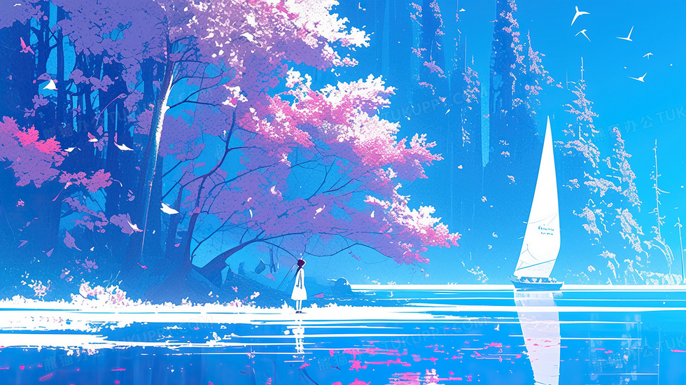 首页 > 插画 > 科技艺术 > 唯美清新 > 梦幻森林女孩小船风景插画