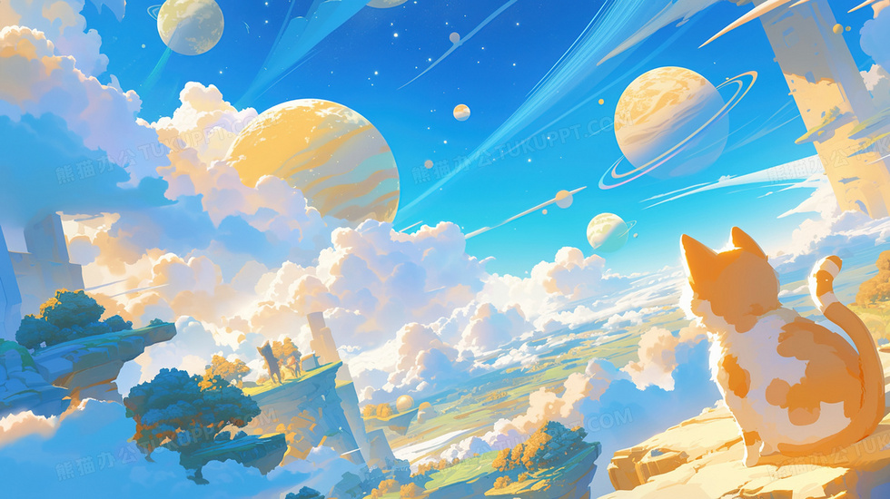 本作品内容为宇宙星空下的宠物猫咪插画, 格式为 jpg, 大小3 MB, 图片尺寸为2912 x 1632, 源文件无水印, 欢迎使用熊猫办公。 如认为平台内容涉嫌侵权,可通过邮件:tousu@tukuppt.com提出书面通知,我们将及时处理。