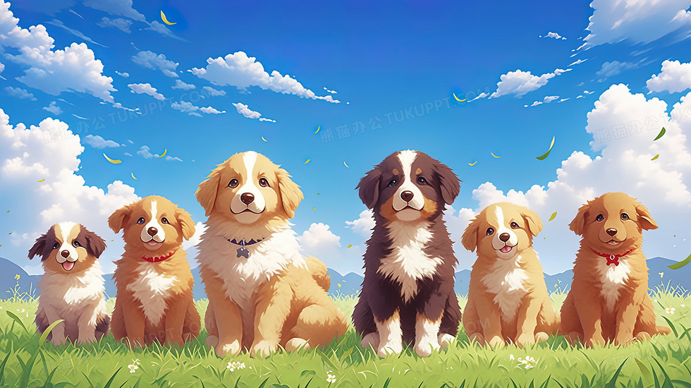 本作品内容为蓝天白云草地上的宠物小狗插画, 格式为 jpg, 大小3 MB, 图片尺寸为2912 x 1632, 源文件无水印, 欢迎使用熊猫办公。 如认为平台内容涉嫌侵权,可通过邮件:tousu@tukuppt.com提出书面通知,我们将及时处理。