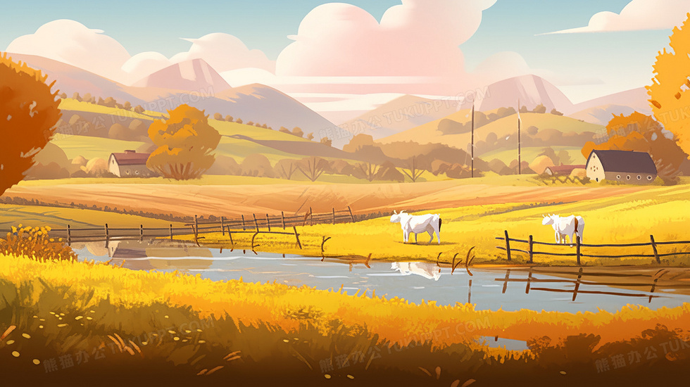 本作品内容为金色秋天郊外农庄唯美自然风光创意插画, 格式为 jpg, 大小3 MB, 图片尺寸为2912 x 1632, 源文件无水印, 欢迎使用熊猫办公。 如认为平台内容涉嫌侵权,可通过邮件:tousu@tukuppt.com提出书面通知,我们将及时处理。