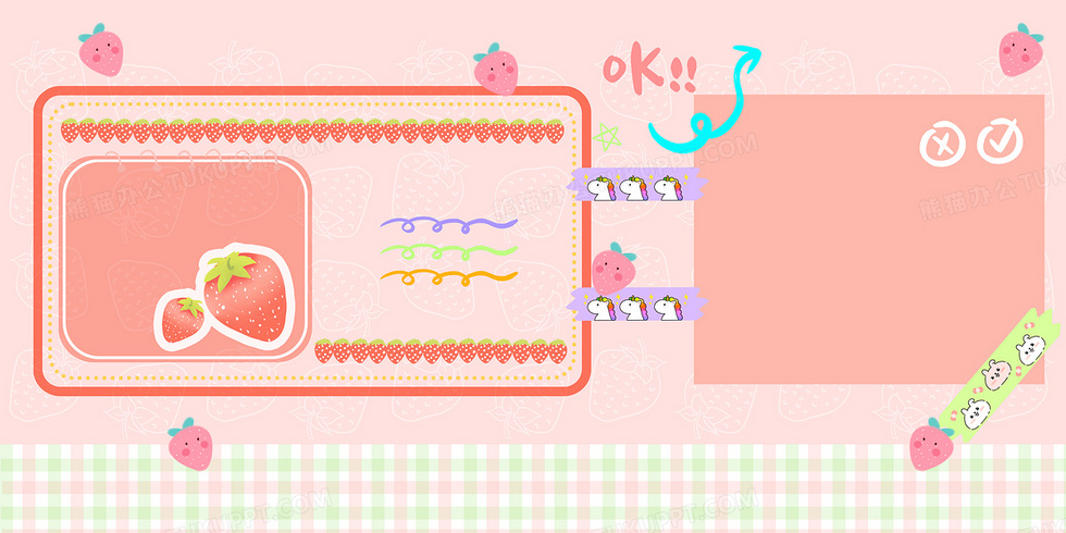 本作品内容为粉色小草莓可爱手账记事贴背景, 格式为 psd, 大小6 MB, 图片尺寸为4724 x 2362, 作品中背景图片无需修改, 源文件无水印,可以直接使用, 欢迎使用熊猫办公。 如认为平台内容涉嫌侵权,可通过邮件:tousu@tukuppt.com提出书面通知,我们将及时处理。