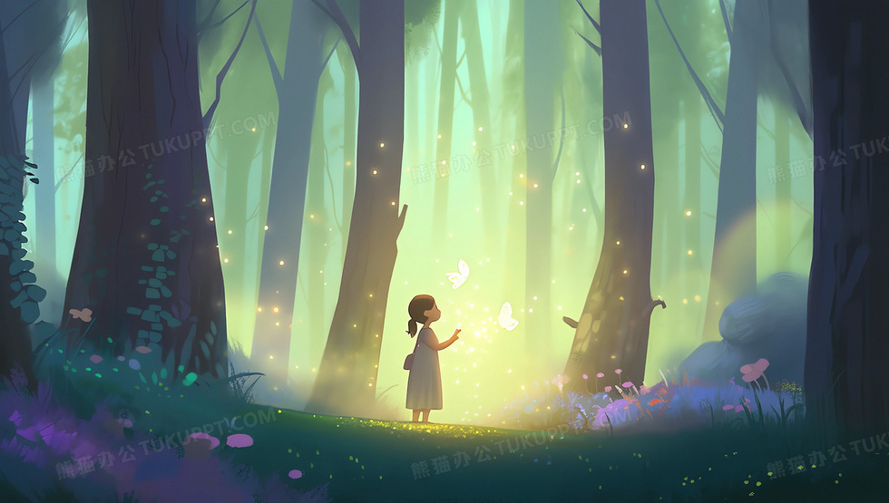 本作品内容为唯美风梦幻森林中想触摸光蝶的可爱女孩和漫天萤火虫创意插画, 格式为 jpg, 大小2 MB, 图片尺寸为2688 x 1524, 源文件无水印, 欢迎使用熊猫办公。 如认为平台内容涉嫌侵权,可通过邮件:tousu@tukuppt.com提出书面通知,我们将及时处理。