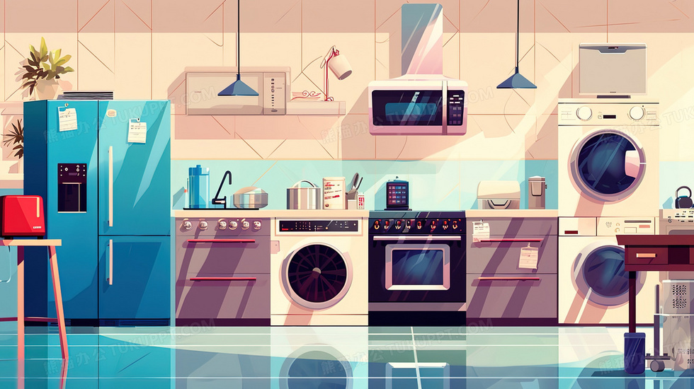 本作品内容为现代家电厨房场景插画, 格式为 jpg, 大小2 MB, 图片尺寸为2912 x 1632, 源文件无水印, 欢迎使用熊猫办公。 如认为平台内容涉嫌侵权,可通过邮件:tousu@tukuppt.com提出书面通知,我们将及时处理。