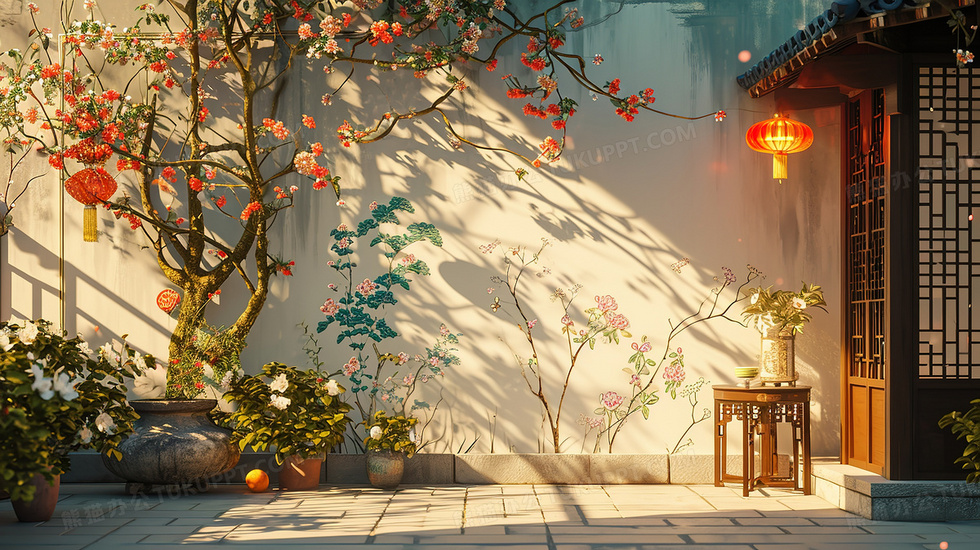 本作品内容为古建筑庭院春节装饰插画, 格式为 jpg, 大小4 MB, 图片尺寸为2912 x 1632, 源文件无水印, 欢迎使用熊猫办公。 如认为平台内容涉嫌侵权,可通过邮件:tousu@tukuppt.com提出书面通知,我们将及时处理。