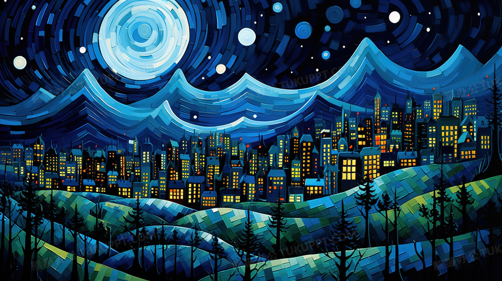 本作品内容为山城的夜景梵高画风插画, 格式为 jpg, 大小4 MB, 图片尺寸为2912 x 1632, 源文件无水印, 欢迎使用熊猫办公。 如认为平台内容涉嫌侵权,可通过邮件:tousu@tukuppt.com提出书面通知,我们将及时处理。