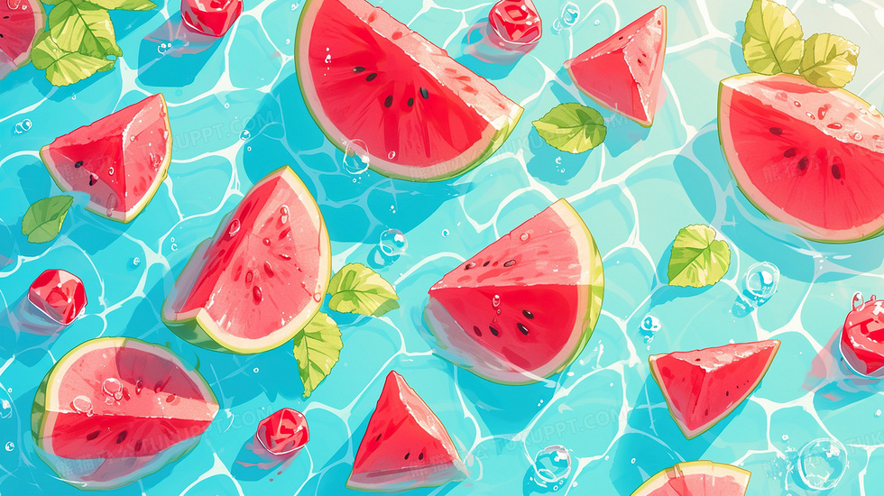 本作品内容为夏日清凉西瓜冰块插画, 格式为 jpg, 大小3 MB, 图片尺寸为2912 x 1632, 源文件无水印, 欢迎使用熊猫办公。 如认为平台内容涉嫌侵权,可通过邮件:tousu@tukuppt.com提出书面通知,我们将及时处理。