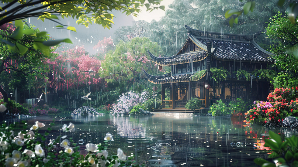 本作品内容为雨中的古典园林插画, 格式为 jpg, 大小4 MB, 图片尺寸为2912 x 1632, 源文件无水印, 欢迎使用熊猫办公。 如认为平台内容涉嫌侵权,可通过邮件:tousu@tukuppt.com提出书面通知,我们将及时处理。