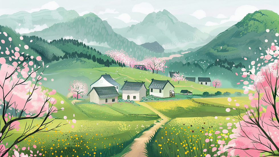 本作品内容为春天乡村田野自然风景插画, 格式为 jpg, 大小4 MB, 图片尺寸为2912 x 1632, 源文件无水印, 欢迎使用熊猫办公。 如认为平台内容涉嫌侵权,可通过邮件:tousu@tukuppt.com提出书面通知,我们将及时处理。