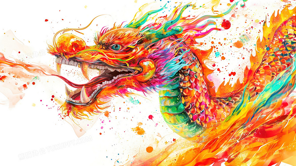 本作品内容为彩色喷墨水墨晕染中国龙插画, 格式为 jpg, 大小4 MB, 图片尺寸为2912 x 1632, 源文件无水印, 欢迎使用熊猫办公。 如认为平台内容涉嫌侵权,可通过邮件:tousu@tukuppt.com提出书面通知,我们将及时处理。