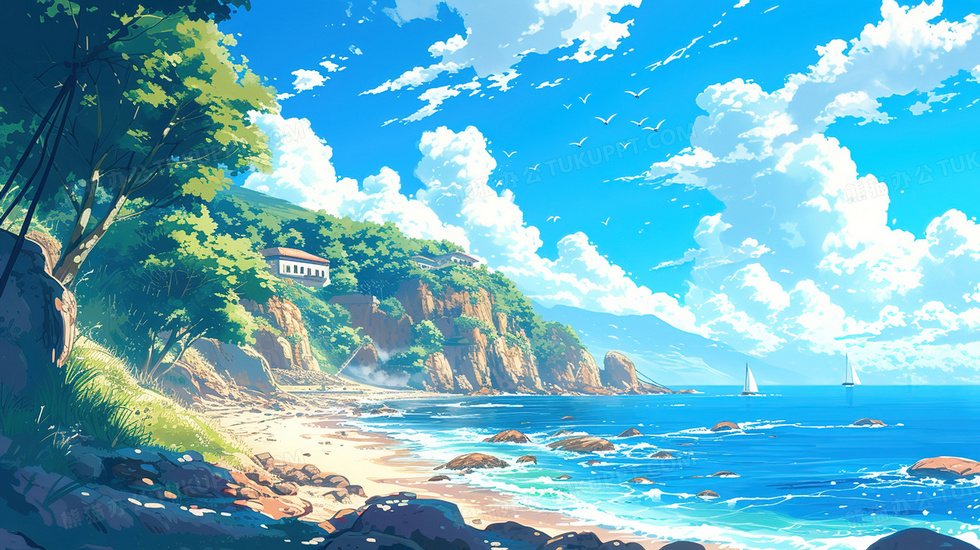 本作品内容为晴朗阳光下的大海沙滩插画, 格式为 jpg, 大小3 MB, 图片尺寸为2912 x 1632, 源文件无水印, 欢迎使用熊猫办公。 如认为平台内容涉嫌侵权,可通过邮件:tousu@tukuppt.com提出书面通知,我们将及时处理。