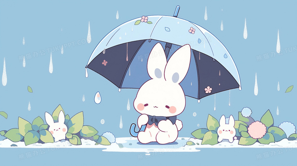 本作品内容为坐在春雨中绿色小草旁边撑伞的可爱小白兔蓝色背景插画, 格式为 jpg, 大小2 MB, 图片尺寸为2912 x 1632, 源文件无水印, 欢迎使用熊猫办公。 如认为平台内容涉嫌侵权,可通过邮件:tousu@tukuppt.com提出书面通知,我们将及时处理。