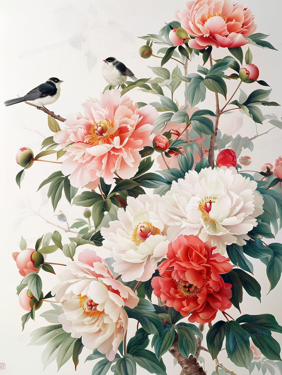 本作品内容为唯美富贵牡丹小鸟插画, 格式为 jpg, 大小3 MB, 图片尺寸为1856 x 2464, 源文件无水印, 欢迎使用熊猫办公。 如认为平台内容涉嫌侵权,可通过邮件:tousu@tukuppt.com提出书面通知,我们将及时处理。