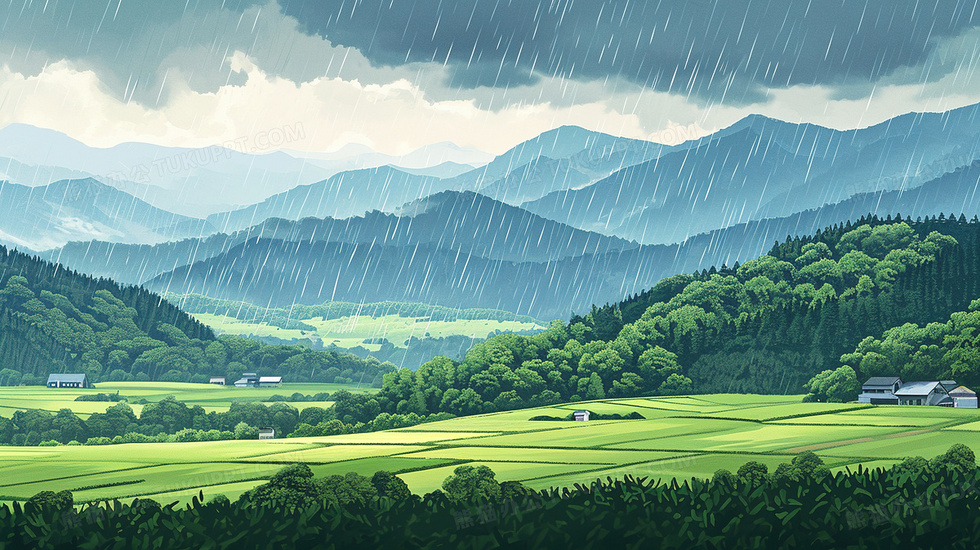 本作品内容为田园乡村下雨田野风景插画, 格式为 jpg, 大小5 MB, 图片尺寸为2912 x 1632, 源文件无水印, 欢迎使用熊猫办公。 如认为平台内容涉嫌侵权,可通过邮件:tousu@tukuppt.com提出书面通知,我们将及时处理。