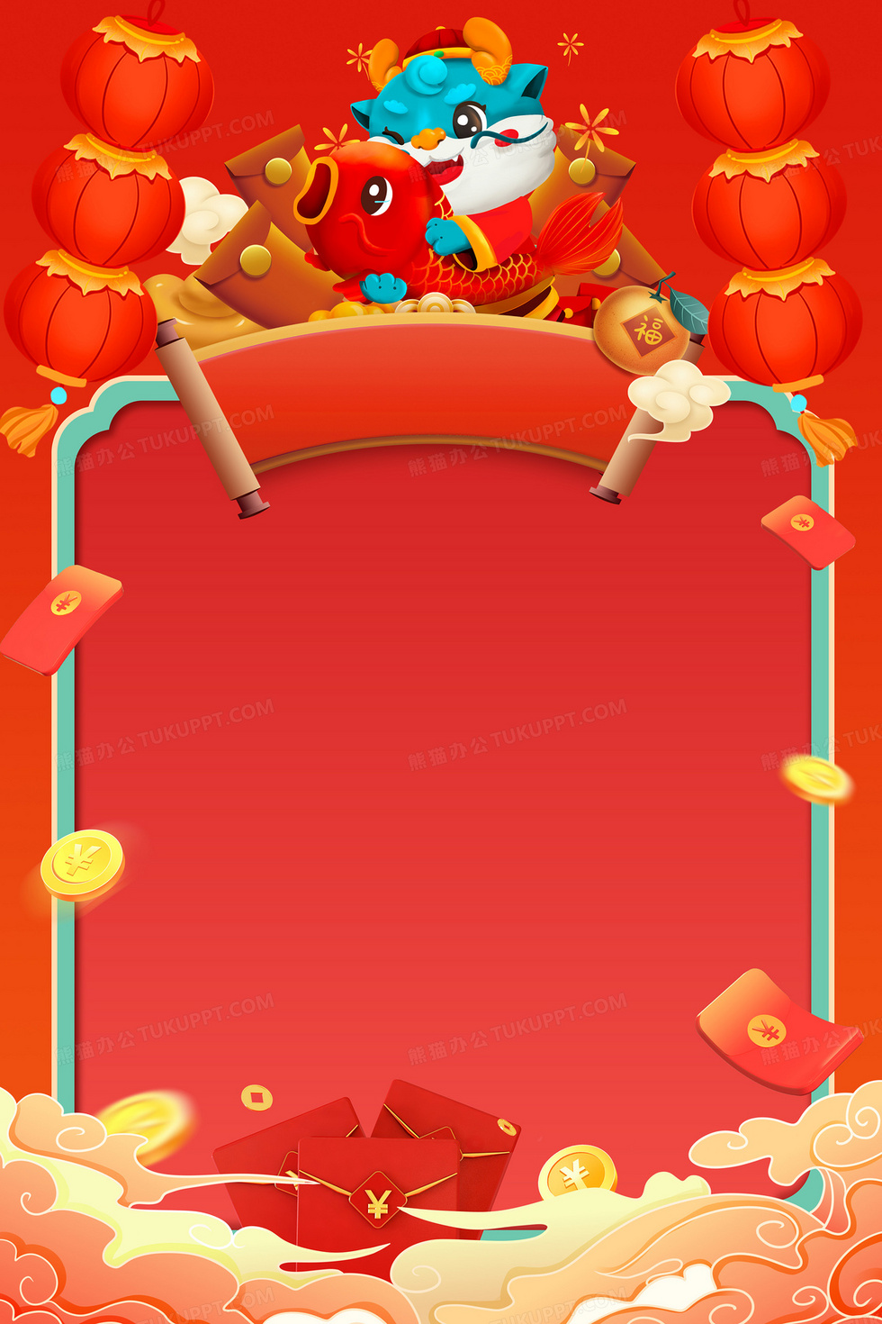 本作品内容为新春龙年卡通龙放假通知背景, 格式为 psd, 大小35 MB, 图片尺寸为3543 x 5315, 作品中背景图片无需修改, 源文件无水印,可以直接使用, 欢迎使用熊猫办公。 如认为平台内容涉嫌侵权,可通过邮件:tousu@tukuppt.com提出书面通知,我们将及时处理。