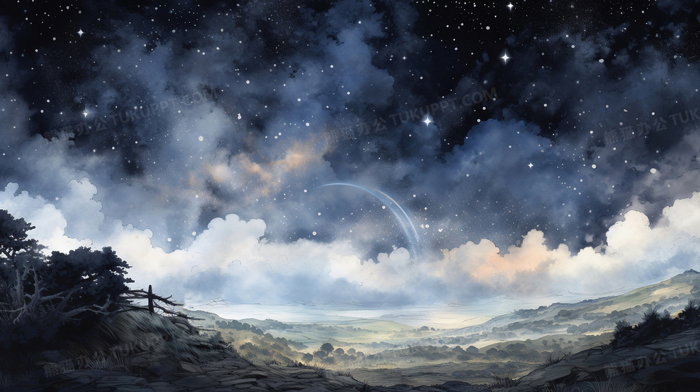 本作品内容为唯美水墨国风星空山水景色插画, 格式为 jpg, 大小4 MB, 图片尺寸为2912 x 1632, 源文件无水印, 欢迎使用熊猫办公。 如认为平台内容涉嫌侵权,可通过邮件:tousu@tukuppt.com提出书面通知,我们将及时处理。