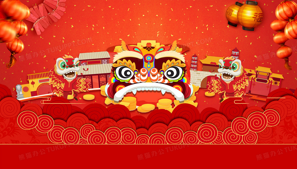 本作品内容为舞狮红色喜庆新年节日背景, 格式为 psd, 图片尺寸为3648 x 2075, 作品中背景图片无需修改, 源文件无水印,可以直接使用, 欢迎使用熊猫办公。 如认为平台内容涉嫌侵权,可通过邮件:tousu@tukuppt.com提出书面通知,我们将及时处理。