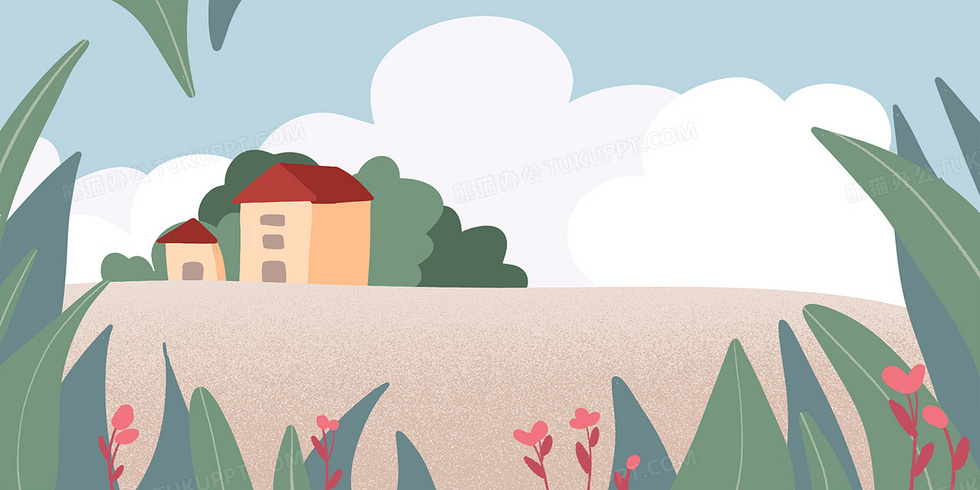 本作品内容为手绘卡通植物蓝天白云红房子背景, 格式为 psd, 大小37 MB, 图片尺寸为7087 x 3543, 作品中背景图片无需修改, 源文件无水印,可以直接使用, 欢迎使用熊猫办公。 如认为平台内容涉嫌侵权,可通过邮件:tousu@tukuppt.com提出书面通知,我们将及时处理。