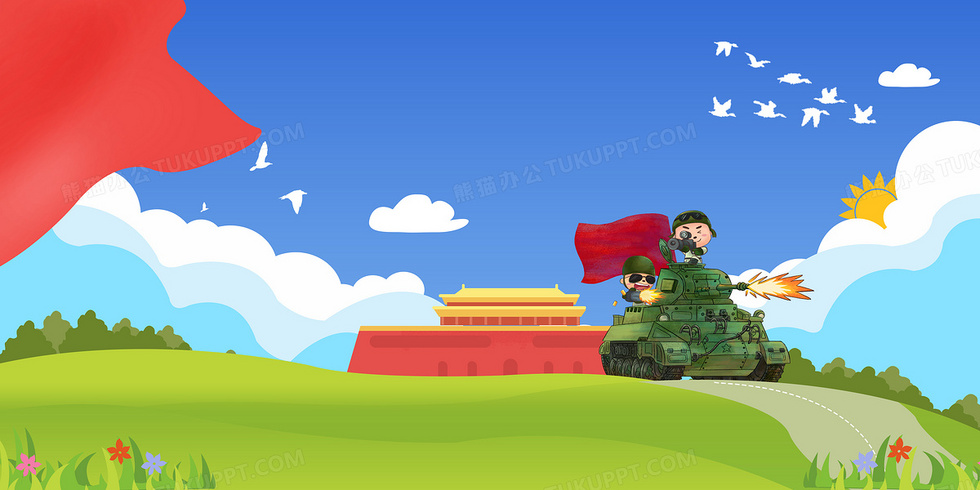 本作品内容为卡通天安门军人坦克党建背景, 格式为 psd, 大小7 MB, 图片尺寸为4724 x 2362, 作品中背景图片无需修改, 源文件无水印,可以直接使用, 欢迎使用熊猫办公。 如认为平台内容涉嫌侵权,可通过邮件:tousu@tukuppt.com提出书面通知,我们将及时处理。