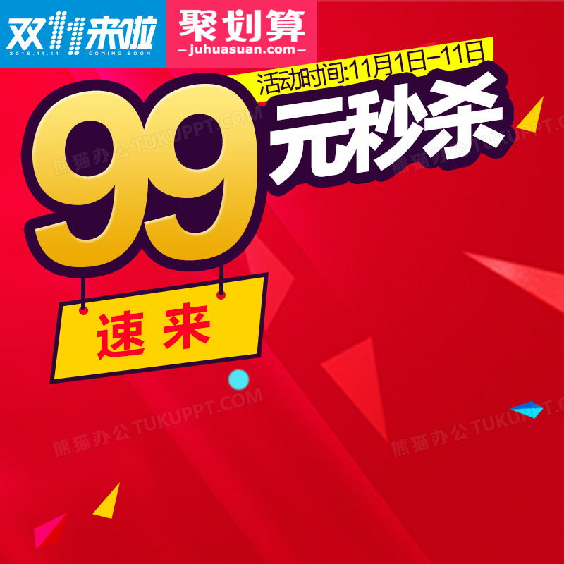 本作品内容为双11聚划算秒杀红色主图, 格式为 psd, 图片尺寸为800 x 800, 作品中背景图片无需修改, 源文件无水印,可以直接使用, 欢迎使用熊猫办公。 如认为平台内容涉嫌侵权,可通过邮件:tousu@tukuppt.com提出书面通知,我们将及时处理。