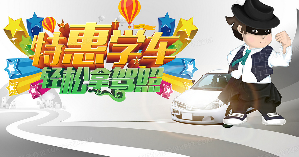 本作品内容为卡通特惠学车背景素材, 格式为 psd, 图片尺寸为9449 x 4961, 作品中背景图片无需修改, 源文件无水印,可以直接使用, 欢迎使用熊猫办公。 如认为平台内容涉嫌侵权,可通过邮件:tousu@tukuppt.com提出书面通知,我们将及时处理。
