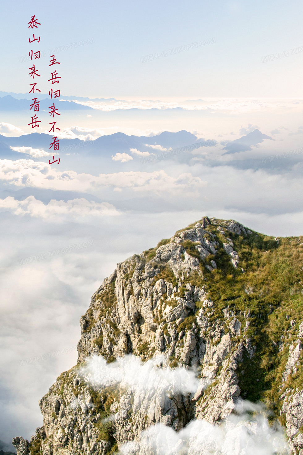 本作品内容为泰山云海摄影图合成背景, 格式为 psd, 大小54 MB, 图片尺寸为2362 x 3543, 作品中背景图片无需修改, 源文件无水印,可以直接使用, 欢迎使用熊猫办公。 如认为平台内容涉嫌侵权,可通过邮件:tousu@tukuppt.com提出书面通知,我们将及时处理。