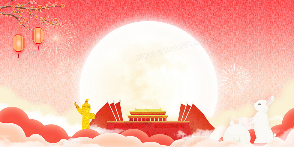 本作品内容为中国风国庆中秋双节玉兔天安门背景, 格式为 psd, 大小33 MB, 图片尺寸为4724 x 2362, 作品中背景图片无需修改, 源文件无水印,可以直接使用, 欢迎使用熊猫办公。 如认为平台内容涉嫌侵权,可通过邮件:tousu@tukuppt.com提出书面通知,我们将及时处理。