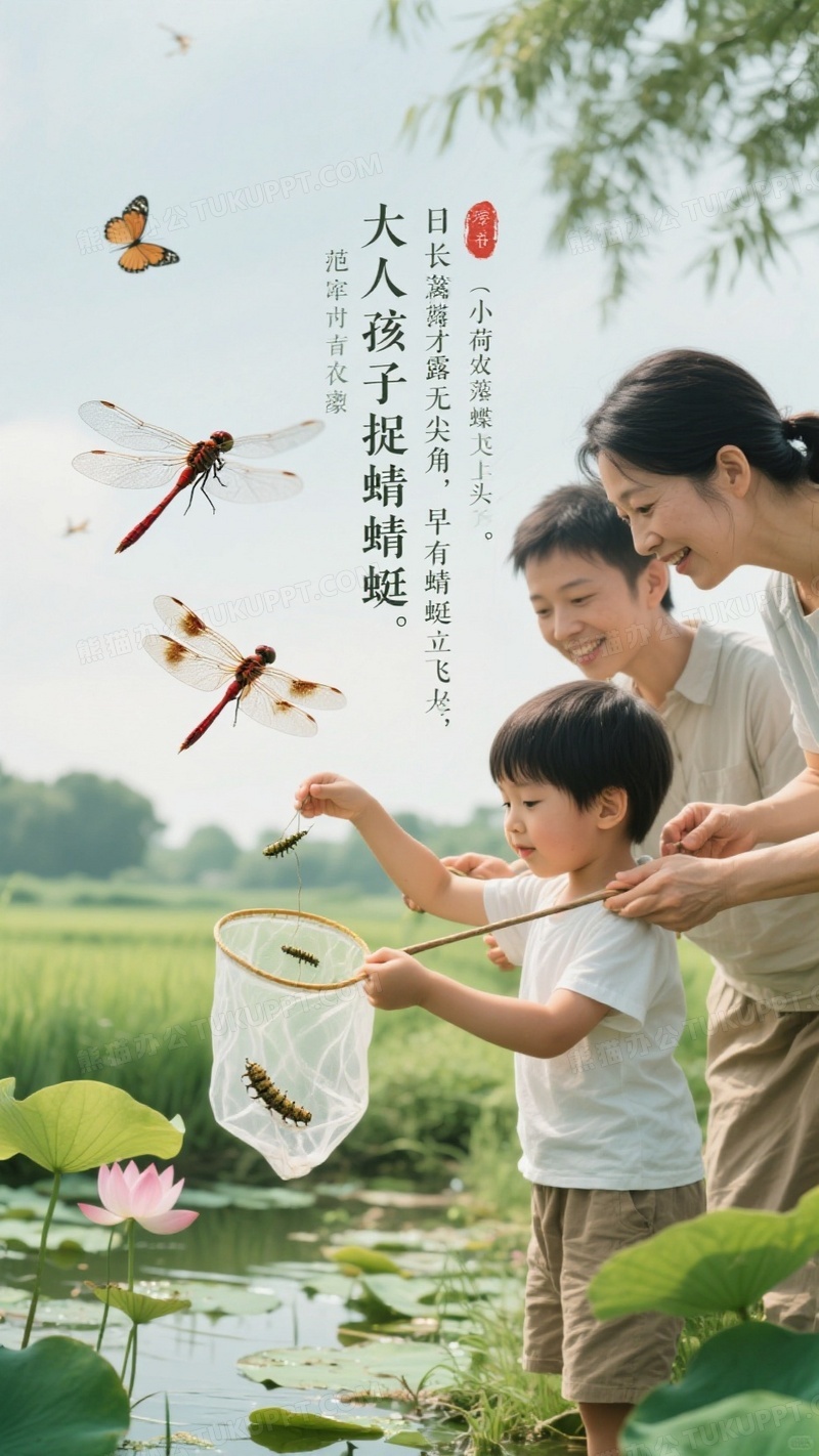 本作品内容为大人孩子捉蜻蜓这一主题可以引申出多角度的解读, 格式为 jpg, 大小1 MB, 图片尺寸为936 x 1664, 源文件无水印, 欢迎使用熊猫办公。 如认为平台内容涉嫌侵权,可通过邮件:tousu@tukuppt.com提出书面通知,我们将及时处理。