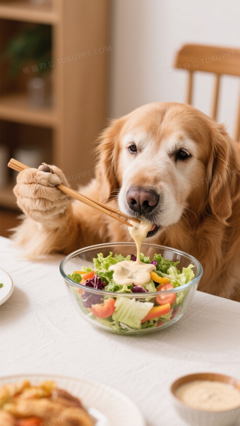 本作品内容为餐桌前金毛用爪子抓着筷子夹玻璃盆里的浇着沙拉酱的蔬菜沙拉吃, 格式为 jpg, 大小1 MB, 图片尺寸为936 x 1664, 源文件无水印, 欢迎使用熊猫办公。 如认为平台内容涉嫌侵权,可通过邮件:tousu@tukuppt.com提出书面通知,我们将及时处理。