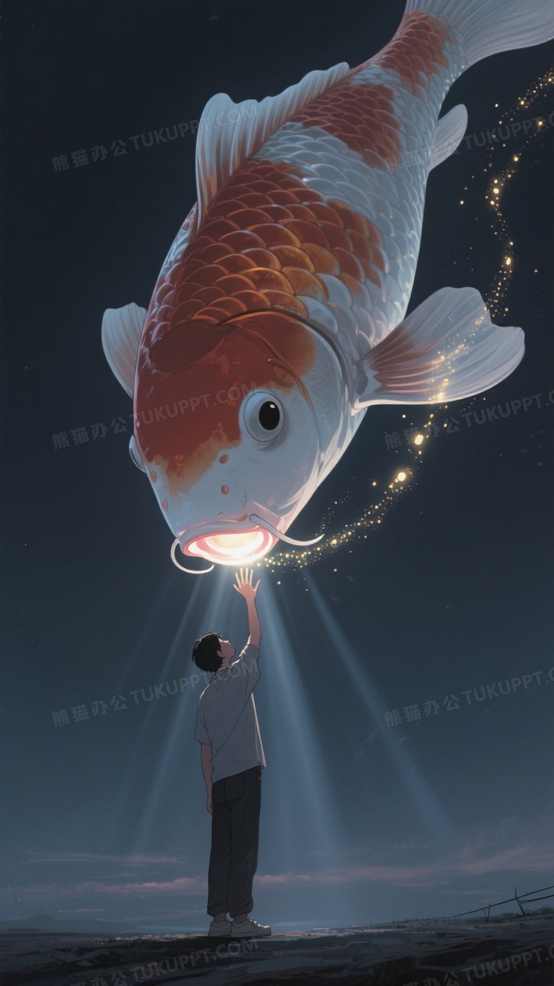 本作品内容为一个缩小的孤独的人仰望天空伸手手抚摸一条巨大从天而降的锦鲤的嘴巴, 格式为 jpg, 大小1 MB, 图片尺寸为936 x 1664, 源文件无水印, 欢迎使用熊猫办公。 如认为平台内容涉嫌侵权,可通过邮件:tousu@tukuppt.com提出书面通知,我们将及时处理。