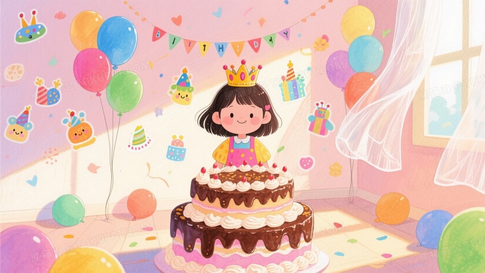 本作品内容为生日派对场景插画小女孩头戴皇冠站在三层巧克力蛋糕前, 格式为 jpg, 大小1 MB, 图片尺寸为1664 x 936, 源文件无水印, 欢迎使用熊猫办公。 如认为平台内容涉嫌侵权,可通过邮件:tousu@tukuppt.com提出书面通知,我们将及时处理。
