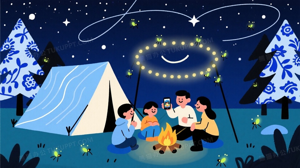 本作品内容为扁平化卡通露营场景星空下全家围着篝火展示手机照片, 格式为 jpg, 大小1 MB, 图片尺寸为1664 x 936, 源文件无水印, 欢迎使用熊猫办公。 如认为平台内容涉嫌侵权,可通过邮件:tousu@tukuppt.com提出书面通知,我们将及时处理。