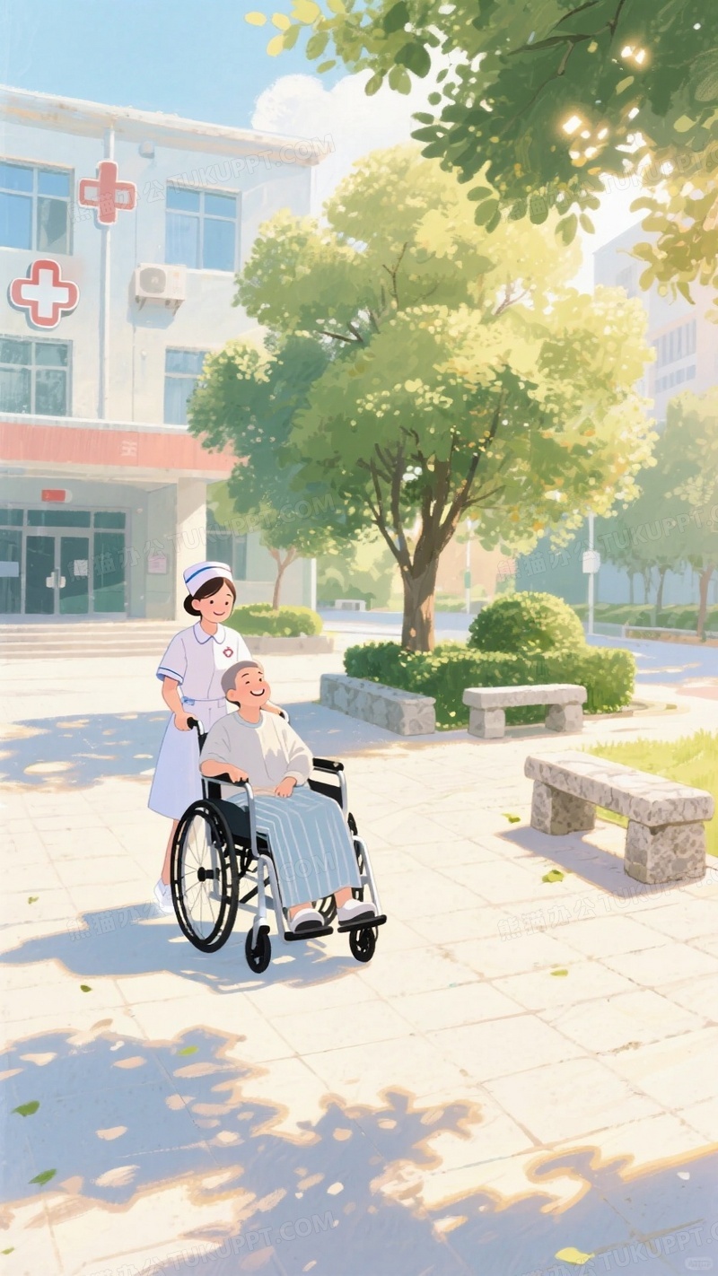 本作品内容为好看的温馨医护插画护士推着轮椅上的病人来到医院的小广场晒太阳, 格式为 jpg, 大小1 MB, 图片尺寸为936 x 1664, 源文件无水印, 欢迎使用熊猫办公。 如认为平台内容涉嫌侵权,可通过邮件:tousu@tukuppt.com提出书面通知,我们将及时处理。
