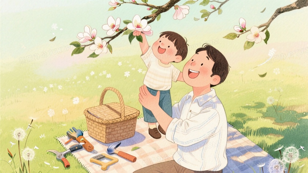 首页 > 插画 > 科技艺术 > 水彩手绘 > 父亲节卡通插画爸爸托举孩子摘木棉花树