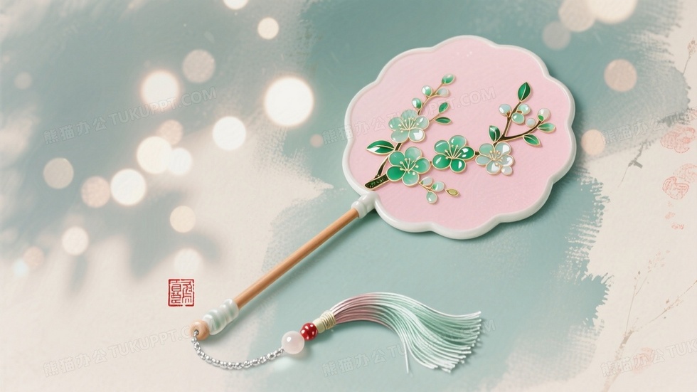 本作品内容为新中式团扇插画翡翠扇形嵌螺钿梅花图案, 格式为 jpg, 大小1 MB, 图片尺寸为1664 x 936, 源文件无水印, 欢迎使用熊猫办公。 如认为平台内容涉嫌侵权,可通过邮件:tousu@tukuppt.com提出书面通知,我们将及时处理。