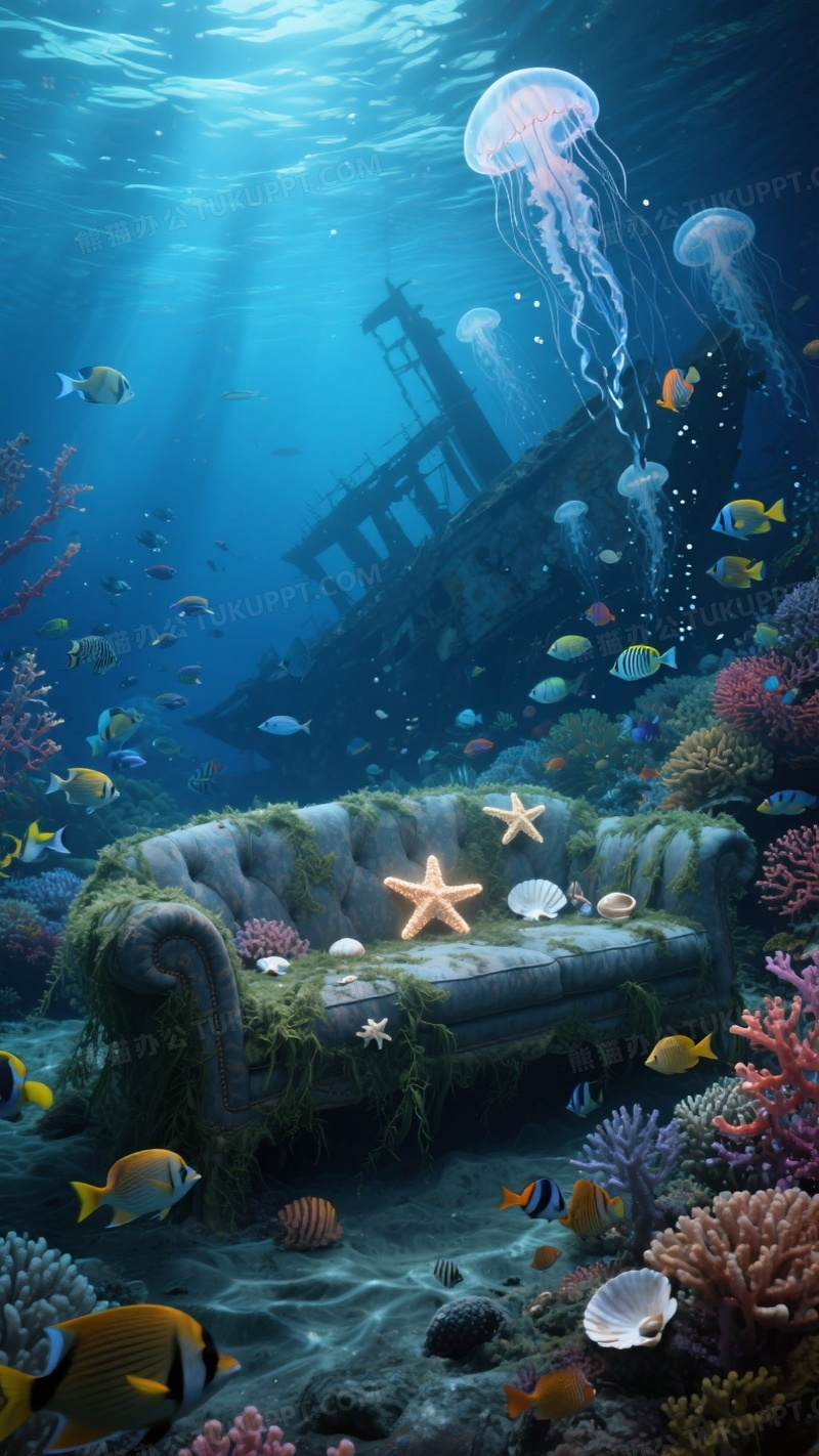 本作品内容为深蓝色海底中漂浮着布满海草的复古布艺沙发, 格式为 jpg, 大小1 MB, 图片尺寸为936 x 1664, 源文件无水印, 欢迎使用熊猫办公。 如认为平台内容涉嫌侵权,可通过邮件:tousu@tukuppt.com提出书面通知,我们将及时处理。