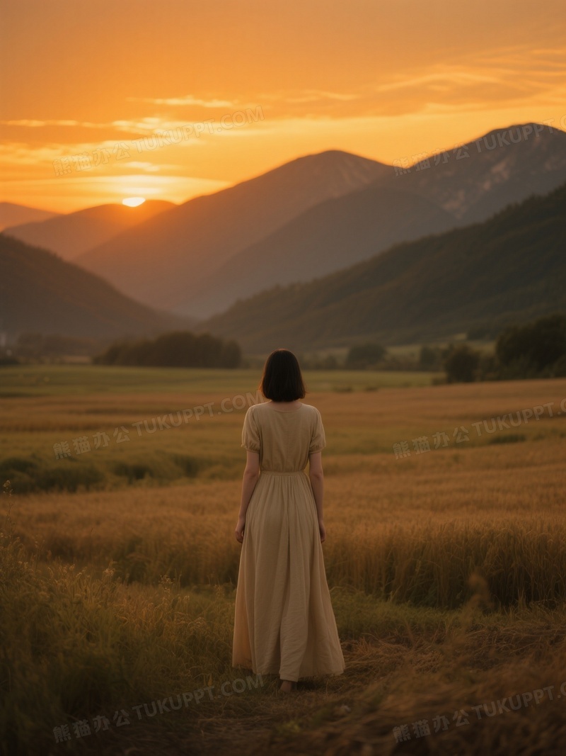 本作品内容为帮我生成一张图片这张图片展示了一位身穿米色长裙的背影女子站在一片广阔的田野中, 格式为 jpg, 大小1 MB, 图片尺寸为1104 x 1472, 源文件无水印, 欢迎使用熊猫办公。 如认为平台内容涉嫌侵权,可通过邮件:tousu@tukuppt.com提出书面通知,我们将及时处理。