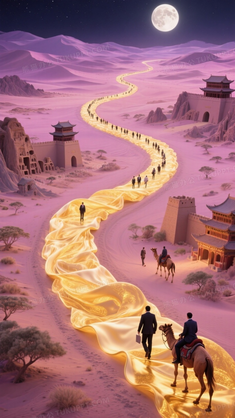 首页 > 插画 > 科技艺术 > 中国风 > 一条蜿蜒的巨大的金色丝绸弧线大路蔓延至整个画面