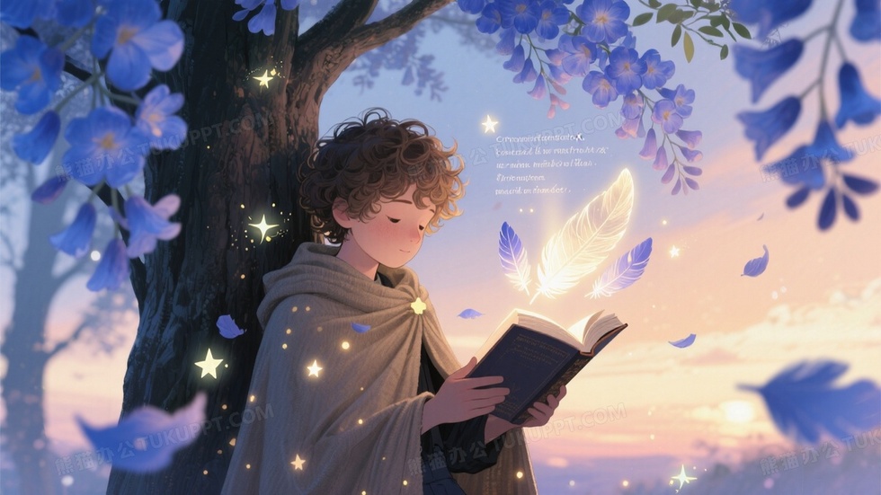 本作品内容为治愈系童话风格卷发少年倚靠开满蓝花楹的树干阅读, 格式为 jpg, 大小1 MB, 图片尺寸为1664 x 936, 源文件无水印, 欢迎使用熊猫办公。 如认为平台内容涉嫌侵权,可通过邮件:tousu@tukuppt.com提出书面通知,我们将及时处理。