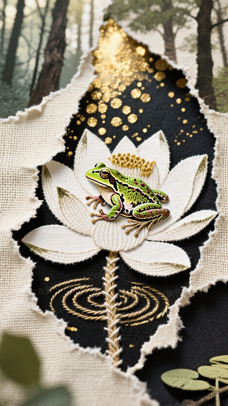 肌理拼贴艺术风格撕纸纹理青蛙栖息在拓印荷花上