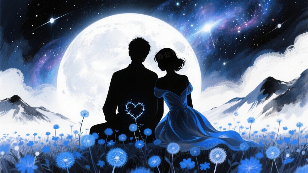 本作品内容为月光花海双人剪影插画, 格式为 jpg, 大小1 MB, 图片尺寸为1664 x 936, 源文件无水印, 欢迎使用熊猫办公。 如认为平台内容涉嫌侵权,可通过邮件:tousu@tukuppt.com提出书面通知,我们将及时处理。