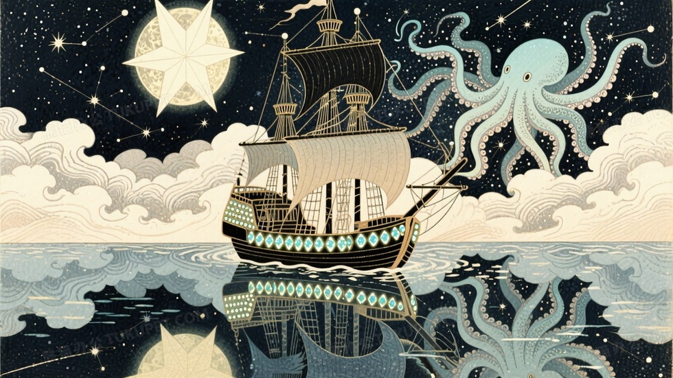 本作品内容为浮世绘版画重构星空航海图, 格式为 jpg, 大小1 MB, 图片尺寸为1664 x 936, 源文件无水印, 欢迎使用熊猫办公。 如认为平台内容涉嫌侵权,可通过邮件:tousu@tukuppt.com提出书面通知,我们将及时处理。
