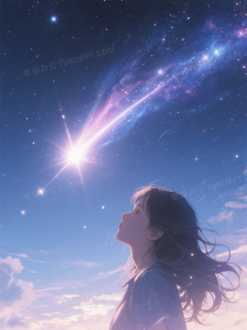 本作品内容为宇宙仙气望向天空一颗流星闪亮耀眼划过天际, 格式为 jpg, 大小1 MB, 图片尺寸为1104 x 1472, 源文件无水印, 欢迎使用熊猫办公。 如认为平台内容涉嫌侵权,可通过邮件:tousu@tukuppt.com提出书面通知,我们将及时处理。