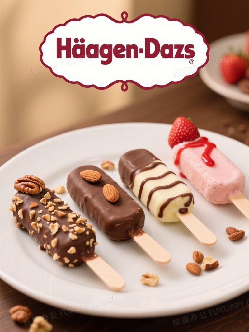 本作品内容为温暖色调广告风格四根并排放在白色盘子上的不同口味哈根达斯冰淇淋, 格式为 jpg, 大小1 MB, 图片尺寸为1104 x 1472, 源文件无水印, 欢迎使用熊猫办公。 如认为平台内容涉嫌侵权,可通过邮件:tousu@tukuppt.com提出书面通知,我们将及时处理。