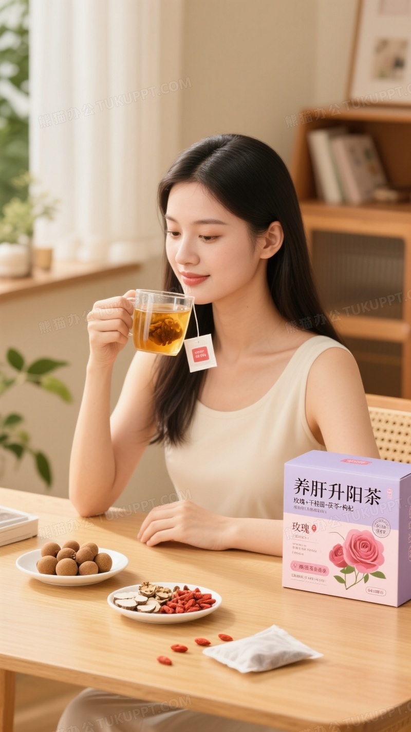 本作品内容为一位美女在桌前喝养肝升阳茶, 格式为 jpg, 大小1 MB, 图片尺寸为936 x 1664, 源文件无水印, 欢迎使用熊猫办公。 如认为平台内容涉嫌侵权,可通过邮件:tousu@tukuppt.com提出书面通知,我们将及时处理。