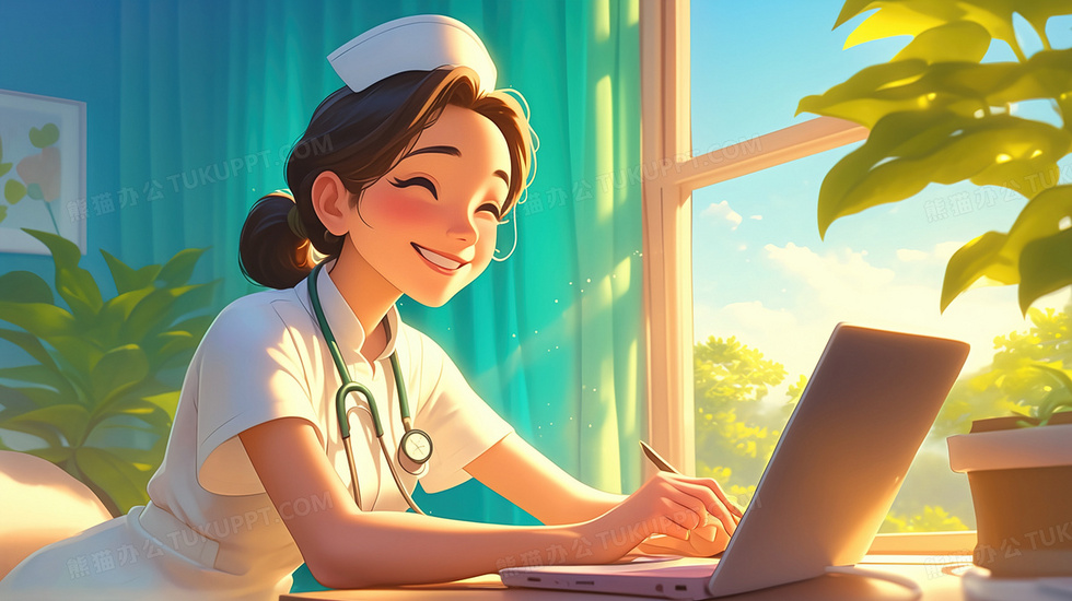 本作品内容为戴着听诊器工作中的女护士卡通插画, 格式为 jpg, 大小2 MB, 图片尺寸为2912 x 1632, 源文件无水印, 欢迎使用熊猫办公。 如认为平台内容涉嫌侵权,可通过邮件:tousu@tukuppt.com提出书面通知,我们将及时处理。