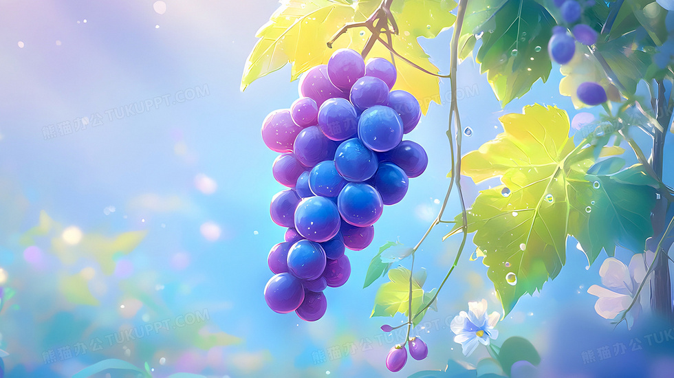 本作品内容为卡通风格新鲜水果葡萄插画, 格式为 jpg, 大小3 MB, 图片尺寸为2912 x 1632, 源文件无水印, 欢迎使用熊猫办公。 如认为平台内容涉嫌侵权,可通过邮件:tousu@tukuppt.com提出书面通知,我们将及时处理。