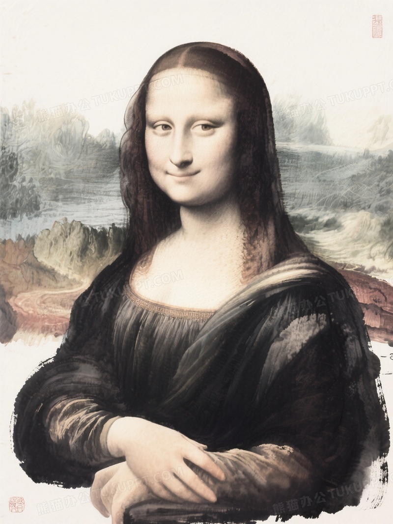 本作品内容为中国写意水墨风格的世界名画蒙娜丽莎的微笑, 格式为 jpg, 大小1 MB, 图片尺寸为1104 x 1472, 源文件无水印, 欢迎使用熊猫办公。 如认为平台内容涉嫌侵权,可通过邮件:tousu@tukuppt.com提出书面通知,我们将及时处理。