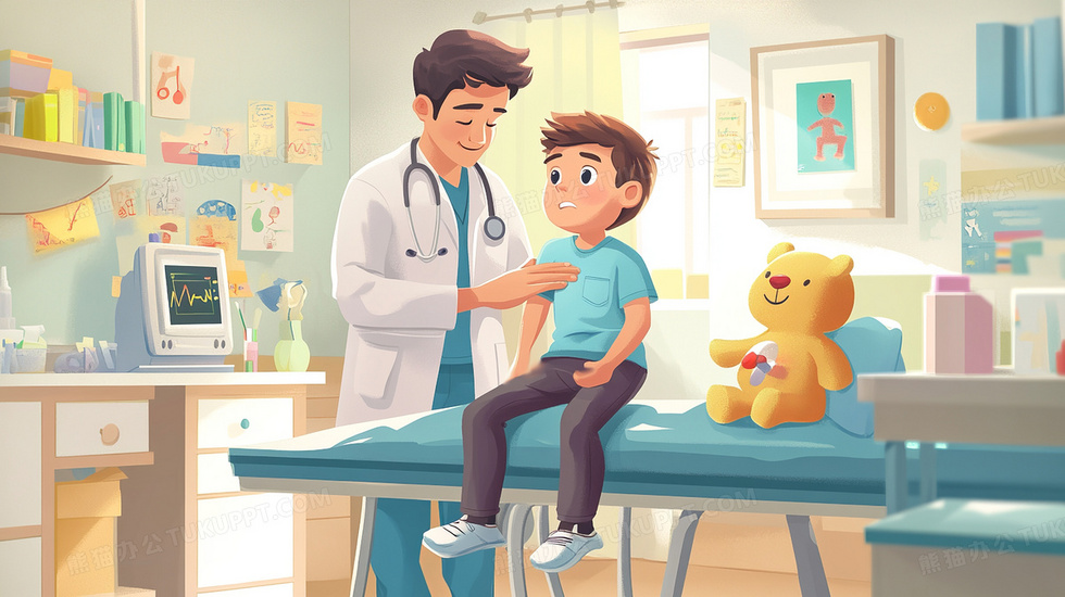 本作品内容为医务室医生在给孩子做检查卡通插画, 格式为 jpg, 大小3 MB, 图片尺寸为2912 x 1632, 源文件无水印, 欢迎使用熊猫办公。 如认为平台内容涉嫌侵权,可通过邮件:tousu@tukuppt.com提出书面通知,我们将及时处理。