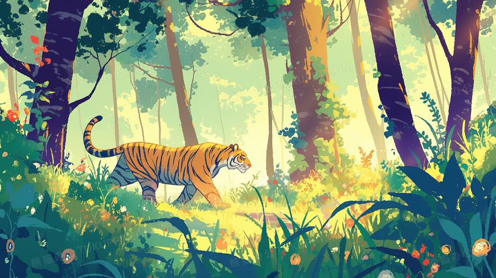 本作品内容为卡通老虎森林树木植物风景插画, 格式为 jpg, 大小4 MB, 图片尺寸为2912 x 1632, 源文件无水印, 欢迎使用熊猫办公。 如认为平台内容涉嫌侵权,可通过邮件:tousu@tukuppt.com提出书面通知,我们将及时处理。