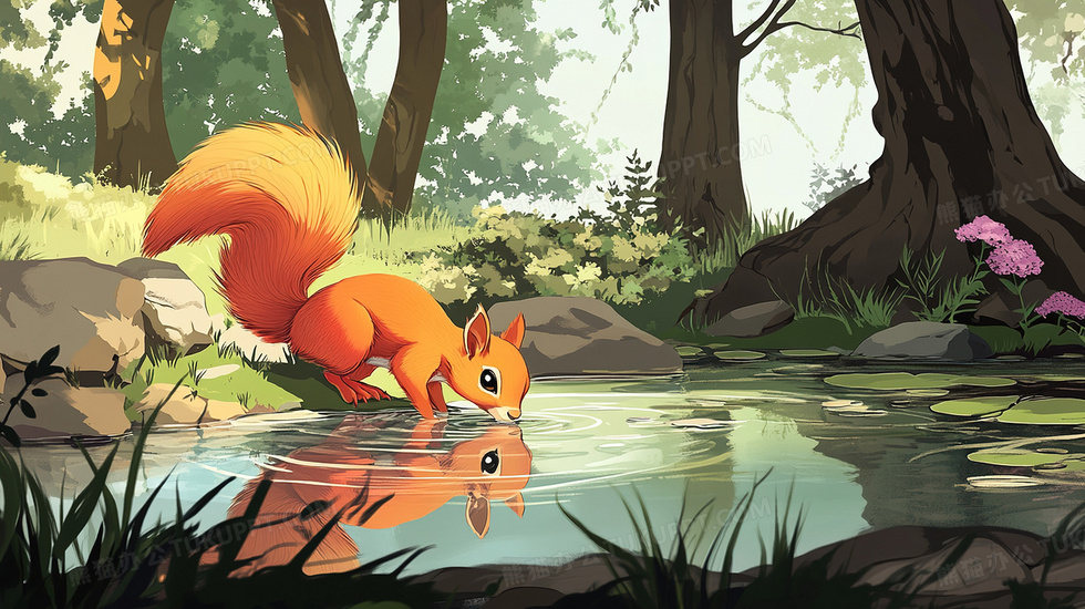 本作品内容为森林湖边喝水的卡通松鼠插画, 格式为 jpg, 大小3 MB, 图片尺寸为2912 x 1632, 源文件无水印, 欢迎使用熊猫办公。 如认为平台内容涉嫌侵权,可通过邮件:tousu@tukuppt.com提出书面通知,我们将及时处理。